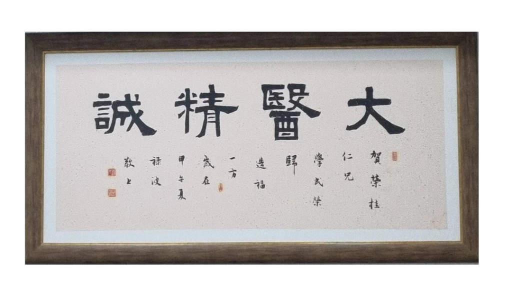 “大医精诚” ในภาษาไทยแปลว่า “การแพทย์ที่ยิ่งใหญ่และซื่อสัตย์” ซึ่งเป็นคำคมจากภาษาจีนที่มีความหมาย “การทำงานในอาชีพทางการแพทย์ควรเป็นอย่างสมบูรณ์และซื่อสัตย์”